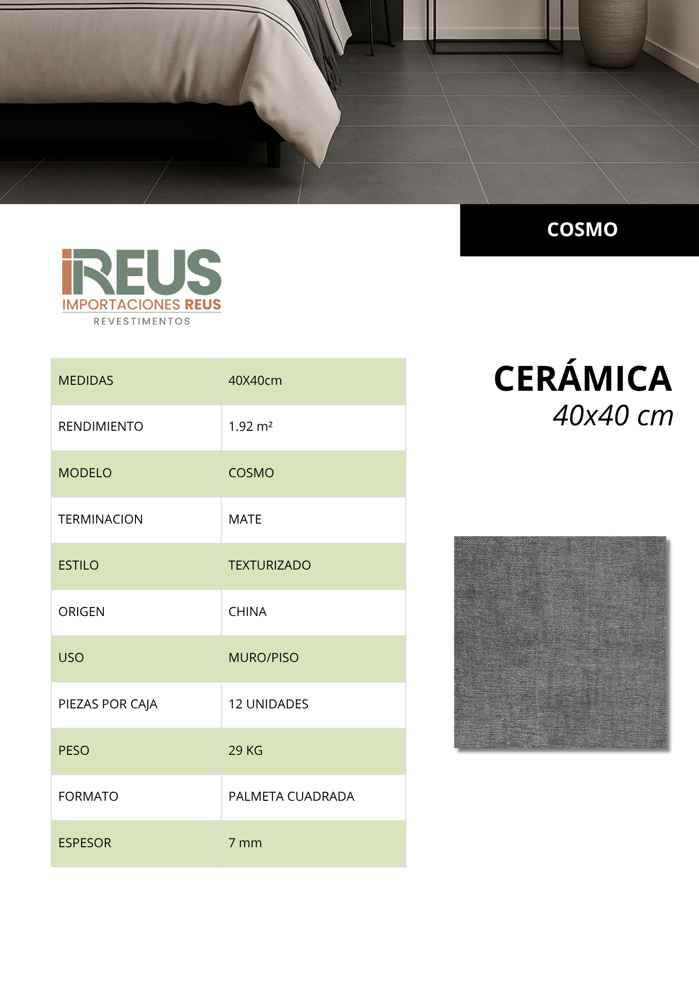 CERAMICA 40X40cm $6.990xm² c/iva - COSMO Stock por sucursal Stock por sucursal $ 13.421 Textura Escoge Textura Mate-A Formato Escoge Formato 40x40 Estilo Escoge Estilo Diseño cantidad Agregar al carro Encargar