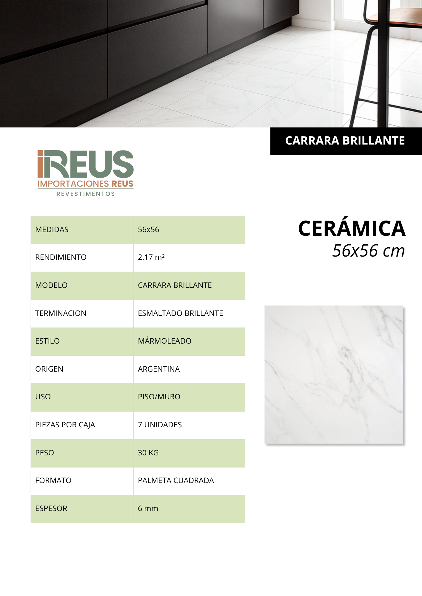 CERÁMICA 56X56cm $6.990xm² c/iva - CARRARA BRILLANTE Stock por sucursal Stock por sucursal $ 15.168 Textura Escoge Textura Brillante Formato Escoge Formato 56x56 Estilo Escoge Estilo Mármol cantidad Agregar al carro Encargar