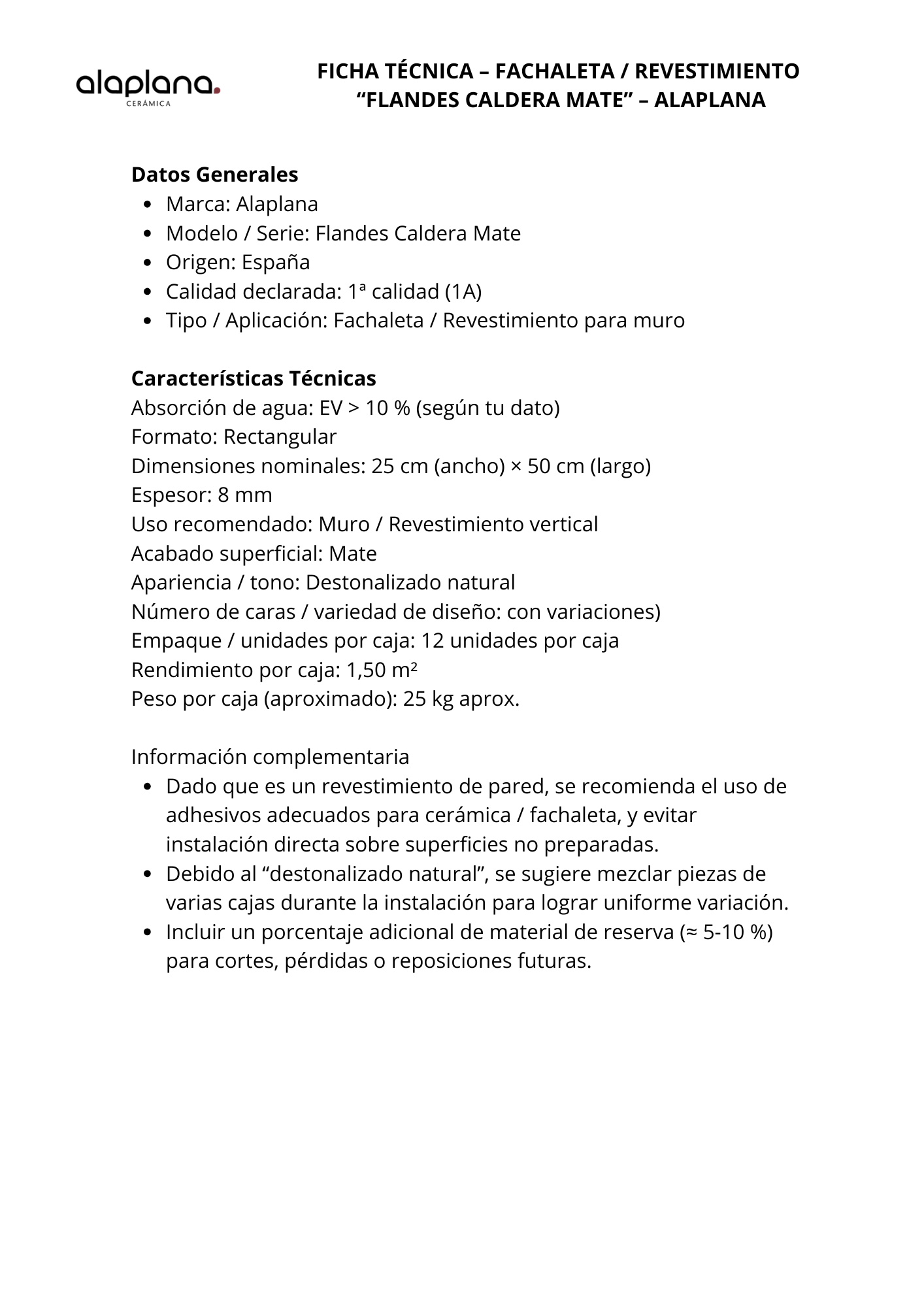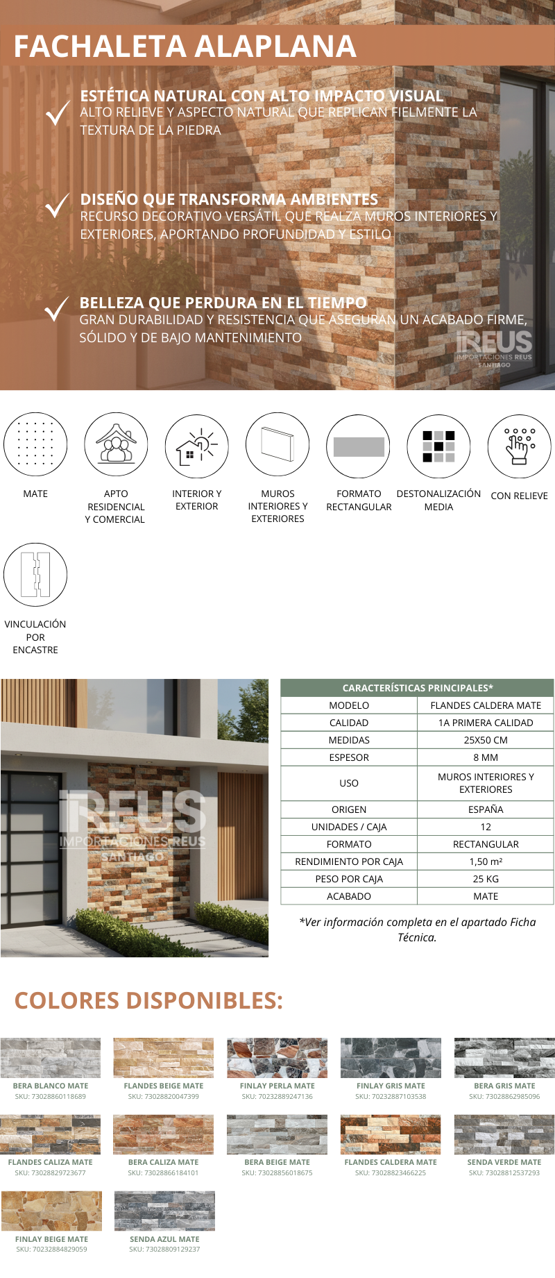 FACHALETA 25x50cm $9.093 c/iva xm² - FLANDES CALDERA MATE Stock por sucursal Stock por sucursal $ 13.640 cantidad Agregar al carro Encargar Imágenes referenciales: los colores pueden variar según la configuración de cada pantalla.
