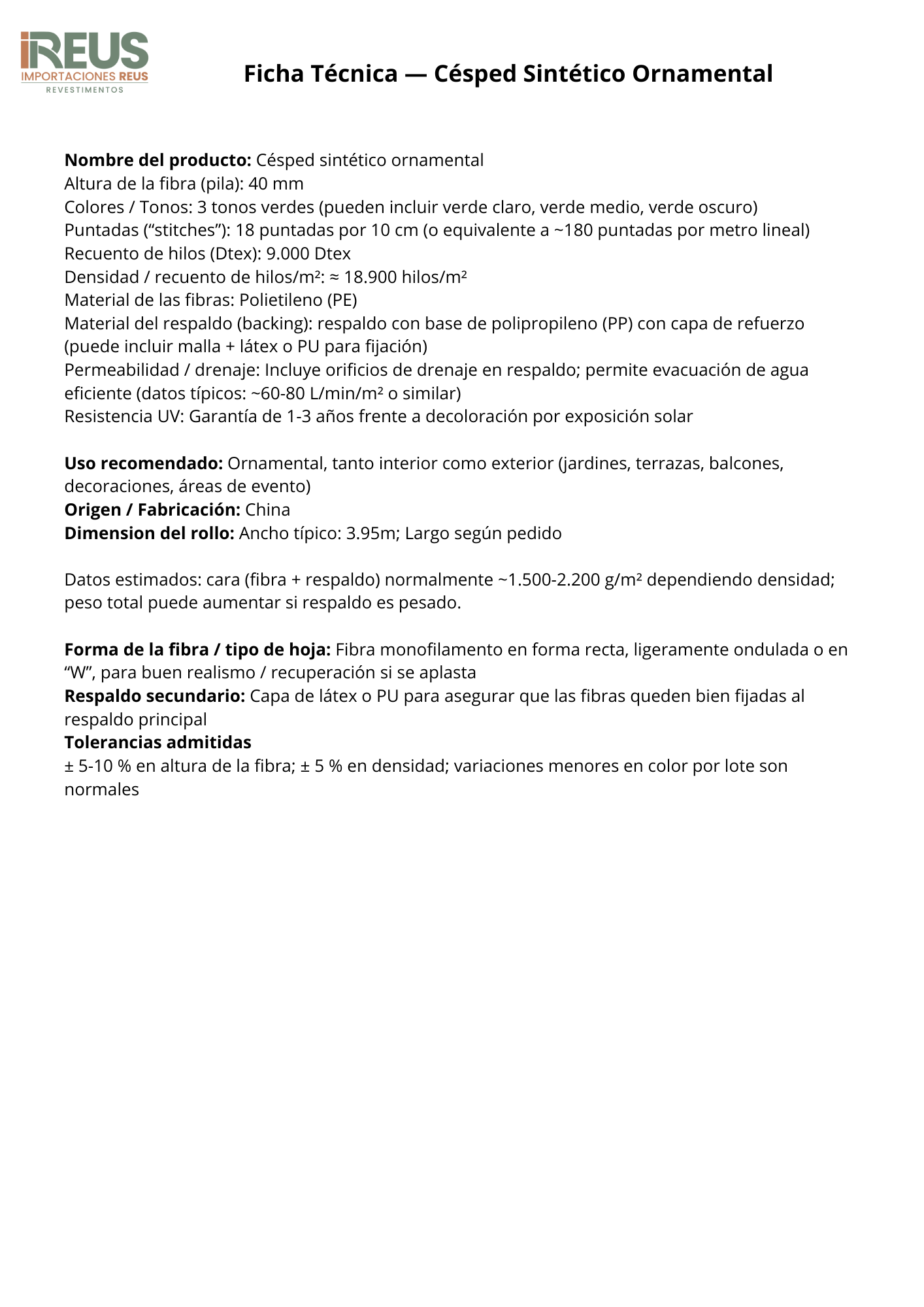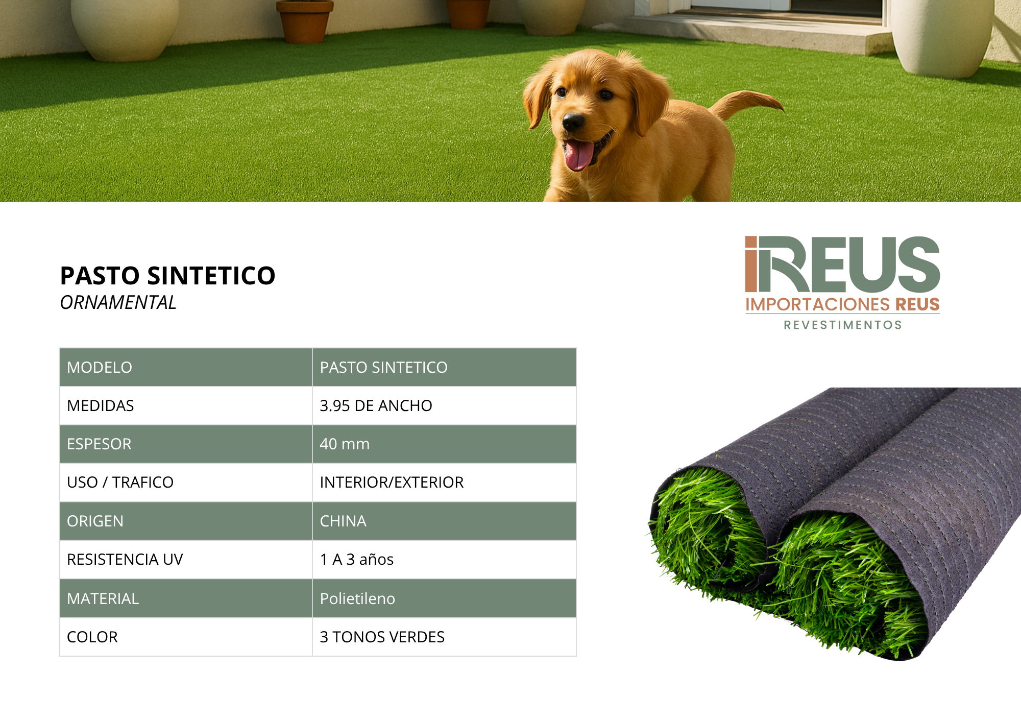 Pasto Sintético 40mm $6.552xm² 3colores (3.95m/de ancho)