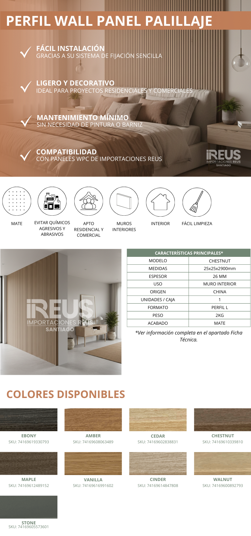 Perfil Wall Panel Palillaje 25x25x2900mm - CHESTNUT Stock por sucursal Stock por sucursal $ 4.990 cantidad Agregar al carro Encargar Imágenes referenciales: los colores pueden variar según la configuración de cada pantalla.