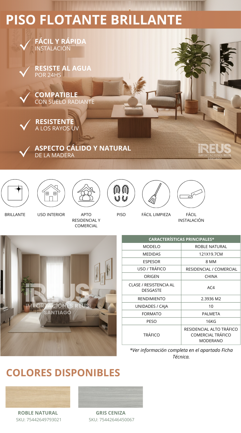 PISO FLOTANTE BRILLANTE 1.21 x 19.7cm $10.490 m² c/iva ROBLE NATURAL