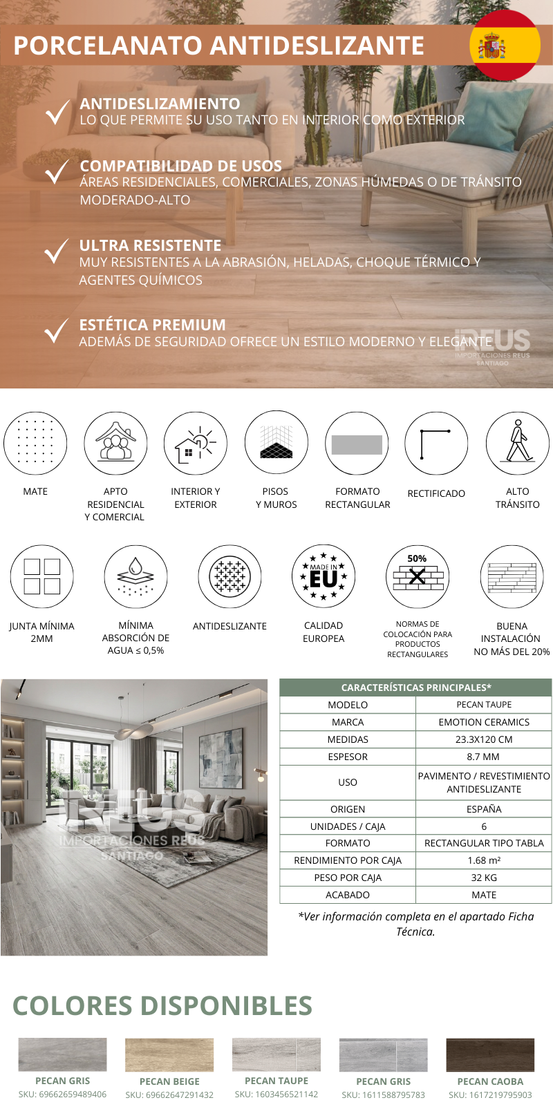Porcelanato 23.3x120cm $17.990xm² - PECAN TAUPE Stock por sucursal Stock por sucursal $ 30.223 cantidad Agregar al carro Encargar Imágenes referenciales: los colores pueden variar según la configuración de cada pantalla.