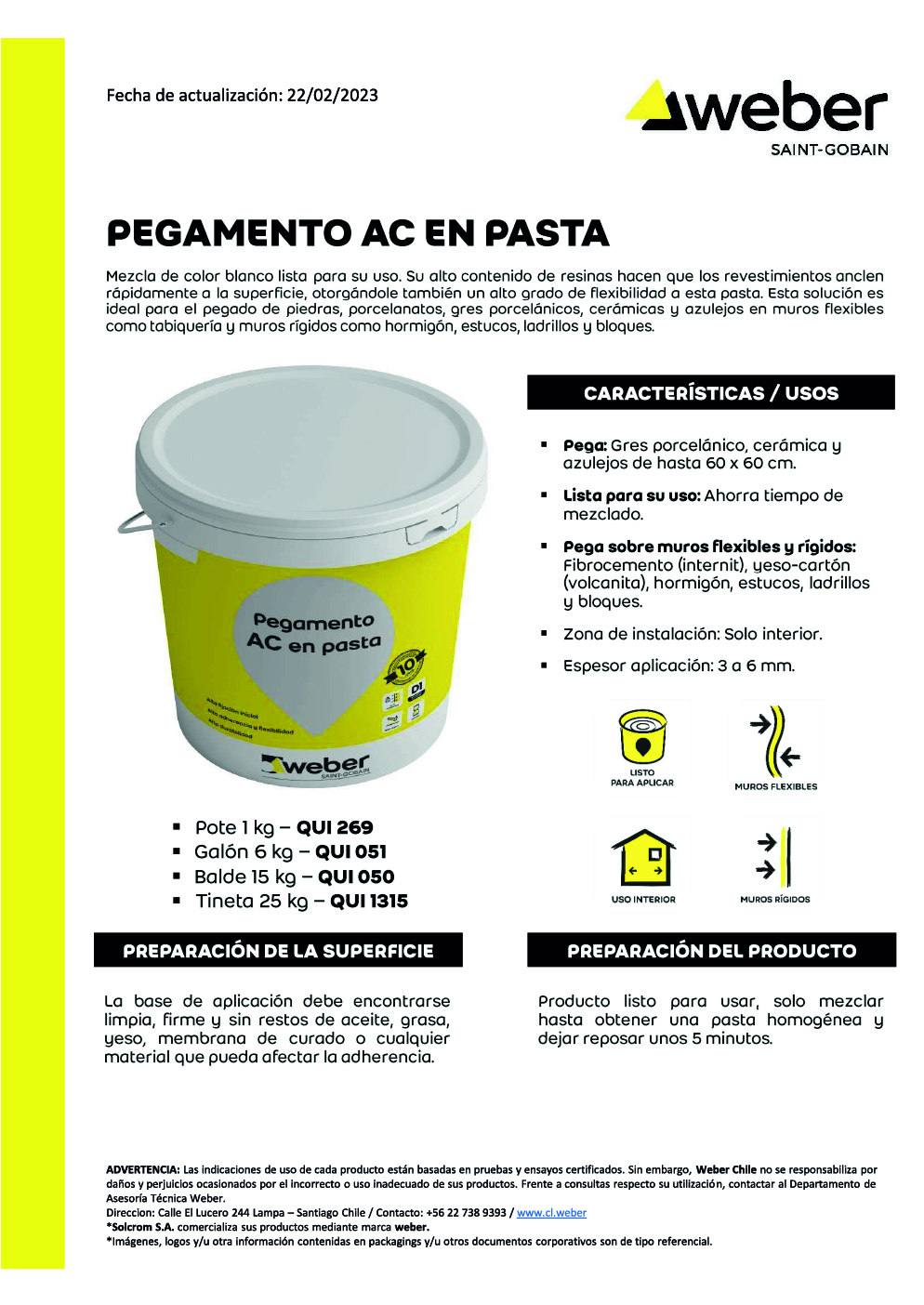 Pegamento AC en pasta lista para el pegado de piedra, gres porcelánico, cerámica y azulejos sobre muros rígidos y tabiques en interiores.