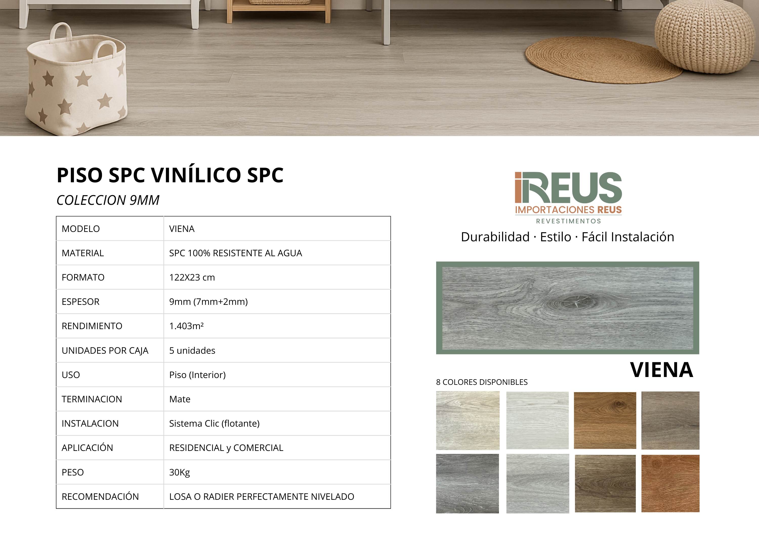 SPC Piso Vinílico 9mm 122x23cm $22.650xm² c/iva - Viena Stock por sucursal Stock por sucursal $ 31.778 Textura Escoge Textura Mate Origen Escoge Origen China Espesor Escoge Espesor 9mm Formato Escoge Formato 122 x 23 cantidad Agregar al carro Encargar * El color de la imagen de referencia puede variar según la configuración de cada pantalla.